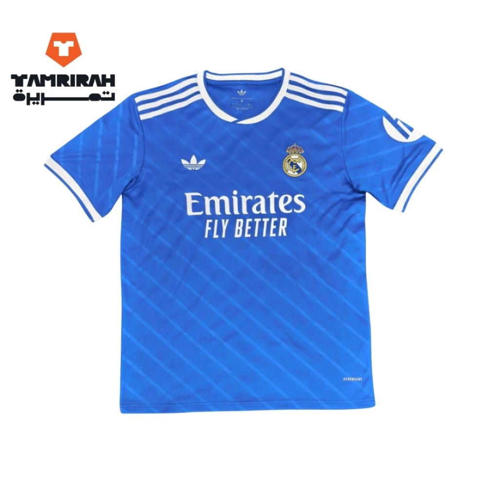 قميص ريال مدريد الثالث للموسم الجديد وبجودة خيالية ومتميزة والذي يتميز بالعديد من التفاصيل التي تجمع بين العراقة واللمسات العصرية , حيث يأتي القميص باللون الأزرق الداكن رويال بلو وهو لون راقي وفخم يعكس هوية النادي العريق مع خطوط مائلة وجذابة .