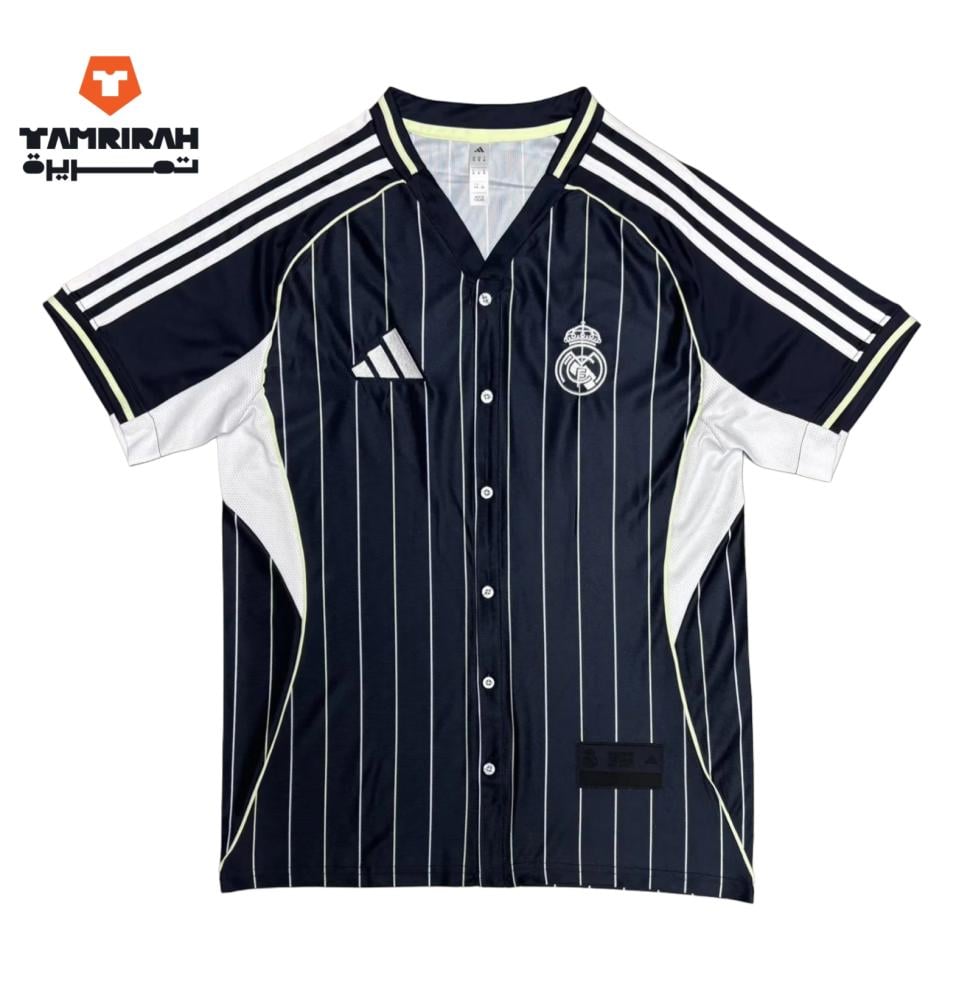 بادر بامتلاك تيشيرت بيسبول ريال مدريد الأسود المخطط 2026 للرجال الآن، وكن جزءًا من تاريخ هذا النادي العريق. ارتديه بفخر وشغف، وشارك العالم حبك لريال مدريد!