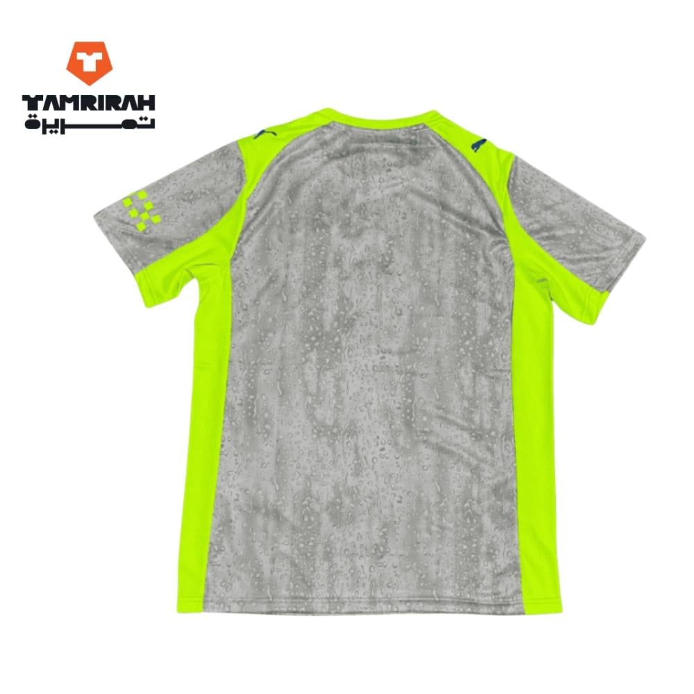 يتميز هذا التيشيرت بتصميمه العصري والجذاب الذي يجمع بين اللون الرمادي الأنيق واللون الأصفر الزاهي. هذا التناغم اللوني يضفي لمسة من الحيوية والتميز على مظهرك، سواء كنت في الملعب أو خارجه.