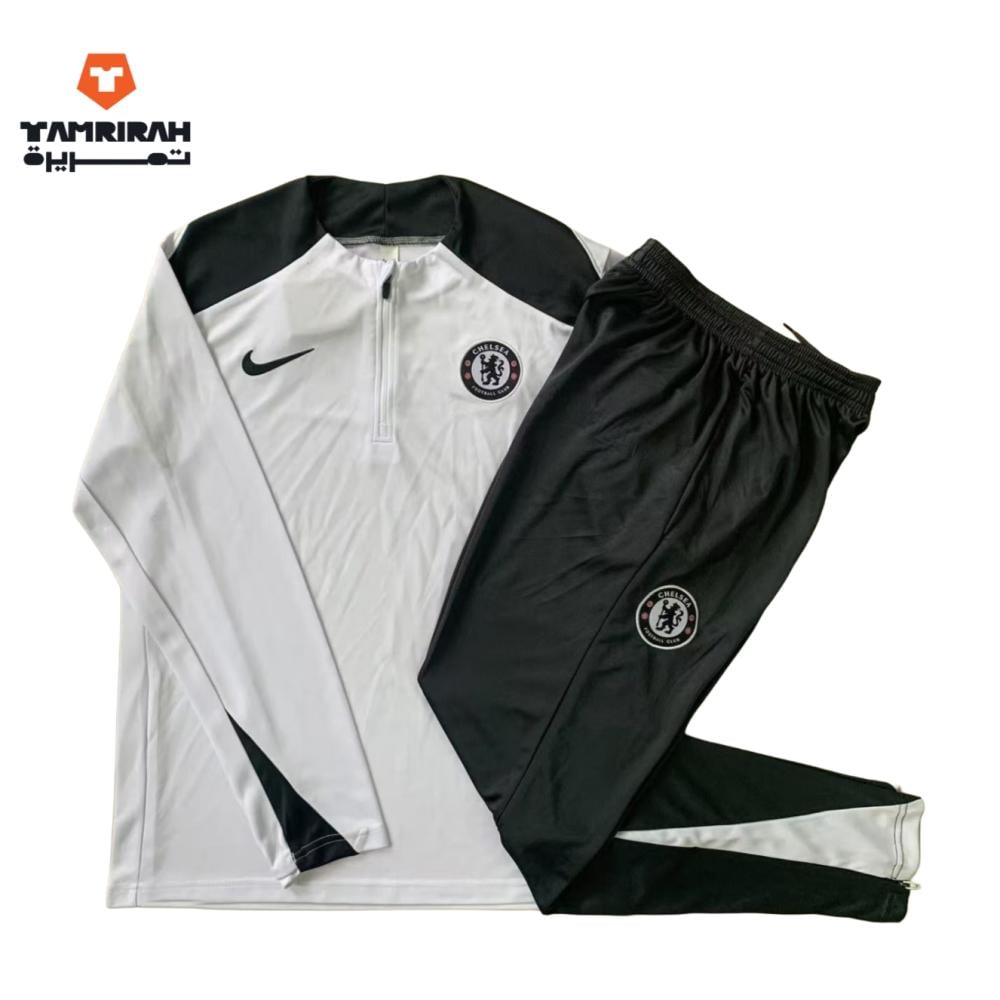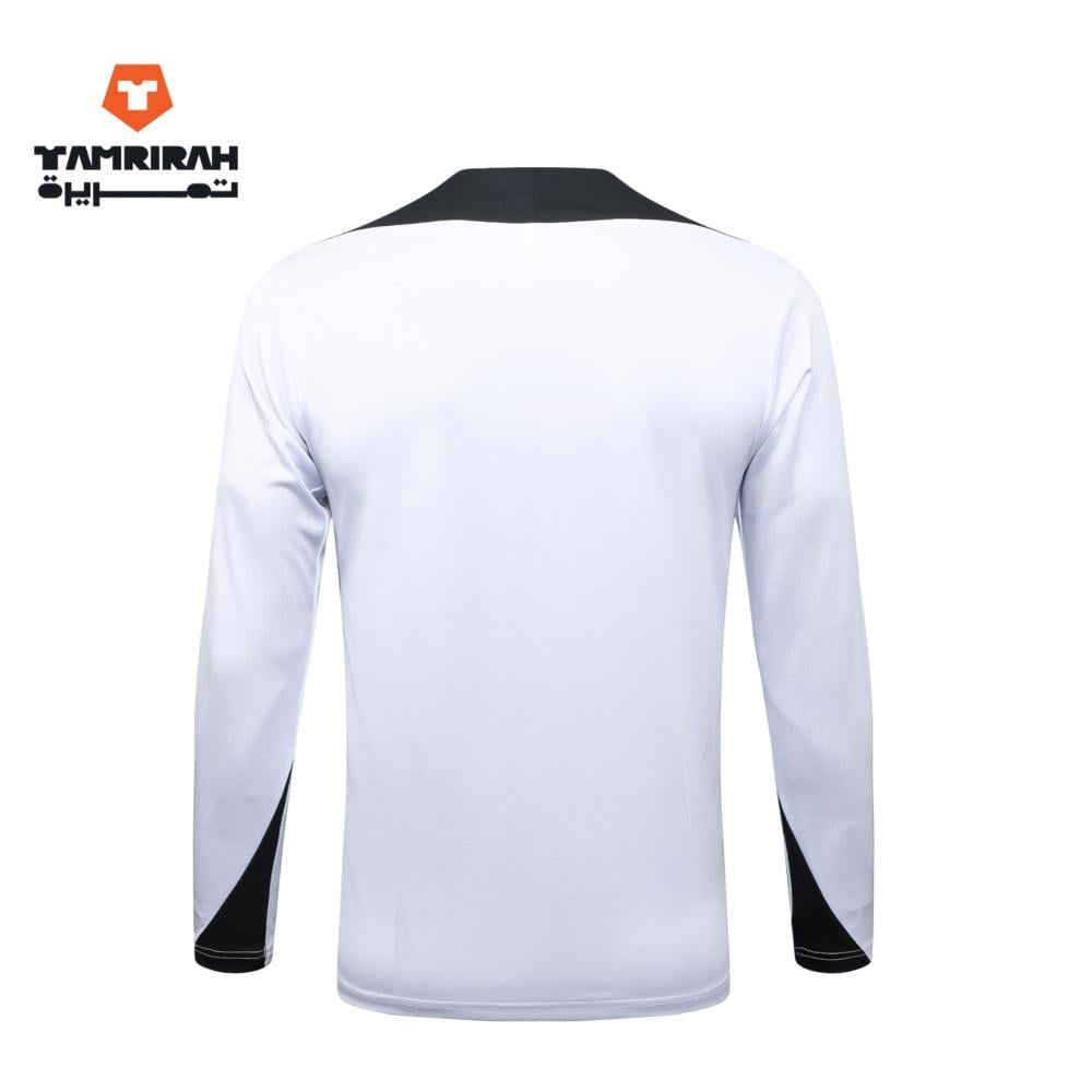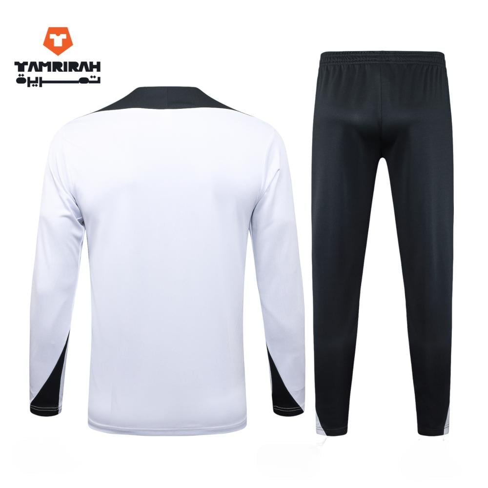 تخيل نفسك وأنت ترتدي هذا الطقم الأنيق، مستعدًا لخوض التمارين بكل حيوية ونشاط. التصميم العصري باللونين الأبيض والأسود يجعلك تبرز في الملعب، بينما شعار النادي يضفي لمسة من الفخر والانتماء.