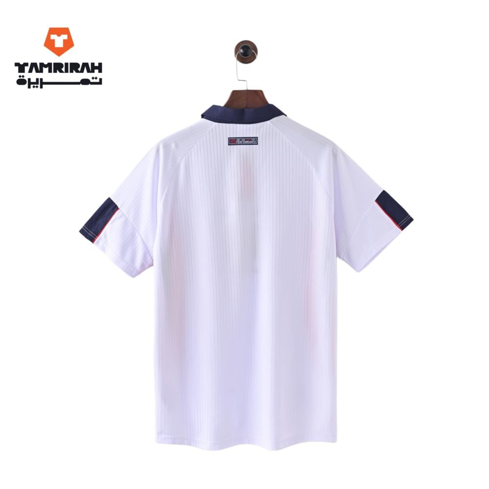 - ألوان إنجلترا الكلاسيكية: الأبيض الناصع والأزرق الداكن والأحمر، تمنح التيشيرت مظهراً أنيقاً وخالداً.