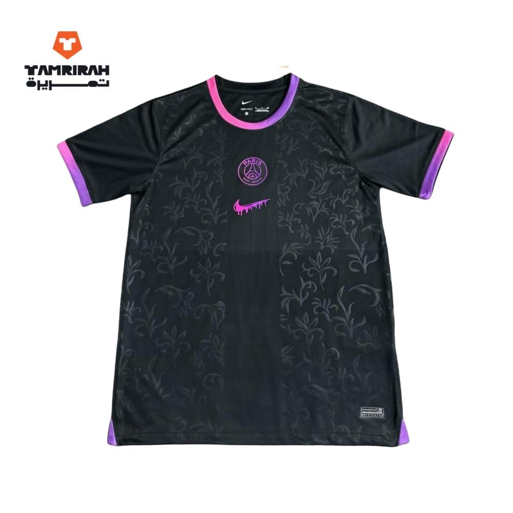 هذا التيشيرت ليس مجرد قطعة ملابس رياضية، بل هو بيان للأناقة والانتماء، مصمم خصيصًا لعشاق باريس سان جيرمان الذين يقدرون التفاصيل الدقيقة والجودة العالية. اللون الأسود الأنيق يضفي عليه هالة من الغموض والجاذبية، بينما تبرز اللمسات البنفسجية الفاتنة عند الأكمام وياقة العنق لتضفي لمسة عصرية وجريئة.