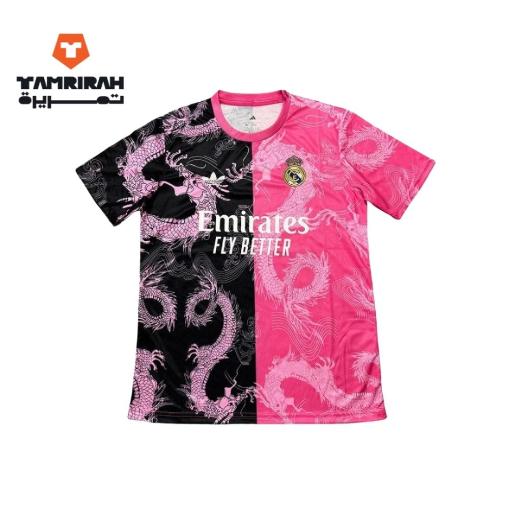 انطلق بشغفك إلى آفاق جديدة مع تيشيرت ريال مدريد بينك إصدار التنين، تحفة فنية تجسد قوة الفريق وأناقة التصميم في آن واحد.